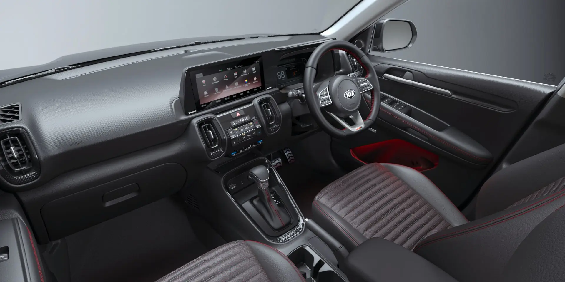 Салон Kia Sonet выглядит не менее стильно и очень современно. В его оснащение вошла цифровая приборная панель с 10,25-дюймовым экраном, мультимедийная система с аналогичным дисплеем, спортивный многофункциональный руль, сиденья с вентиляцией, аудиосистема BOSE Premium с семью динамиками и светодиодная подсветка. Также, несмотря на свою бюджетность, новая модель Kia получила широкий спектр систем безопасности и помощи водителю.