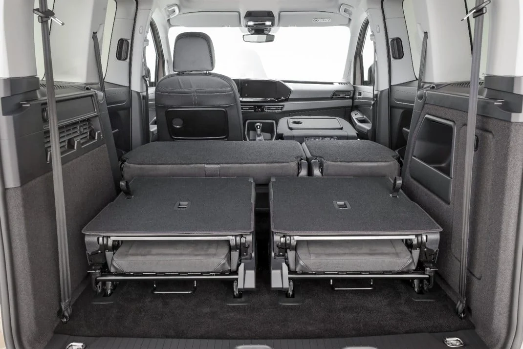 Из новаций отметим то, что спинки сидений второго ряда теперь можно регулировать по углу наклона. В пассажирском варианте и как Kombi сиденья второго ряда можно сложить и откинуть вперед. Три сиденья второго ряда могут складываться или вовсе демонтироваться, что позволяет увеличить объем грузового отсека до 2556 л в короткоколёсной версии и до 3105 л в Caddy Maxi.