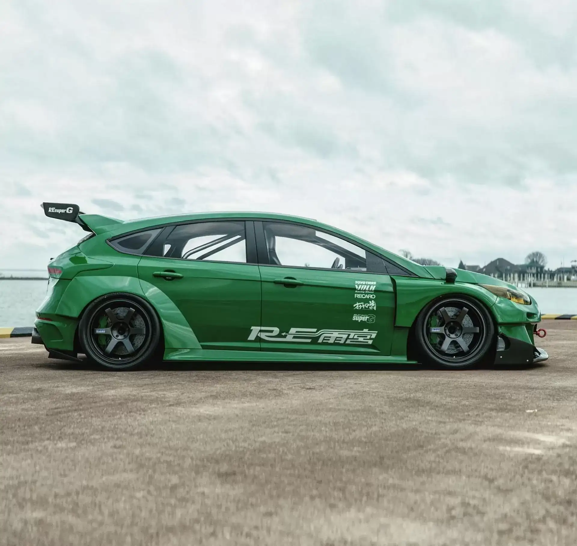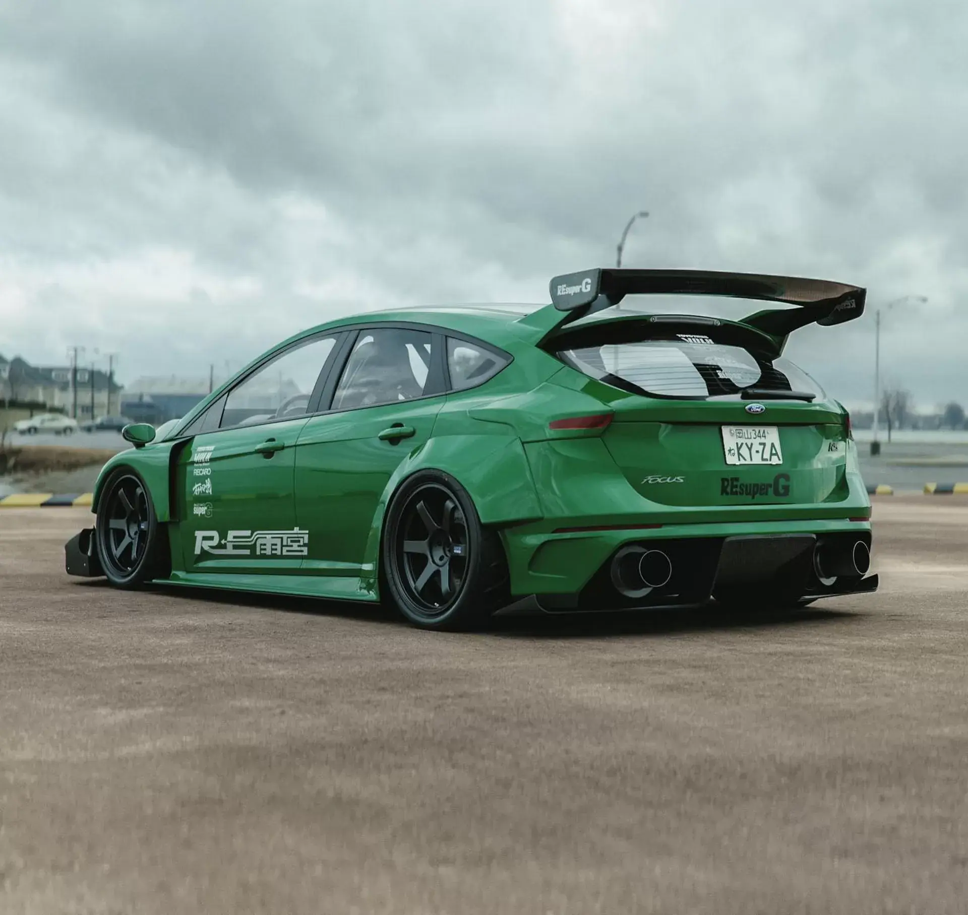 Массивный кузовной обвес сделал Focus похожим на гоночный болид с максимально заниженной подвеской. Самый заметный элемент передней части — внушительный бампер с массивным сплиттером и огромными воздухозаборниками в стилистике RX-7. Раскосые передние фары — желтого цвета. В капоте — две полосы «жабр» для лучшей вентиляции двигателя. Боковые зеркала заднего вида переехали на расширенный передние крылья.