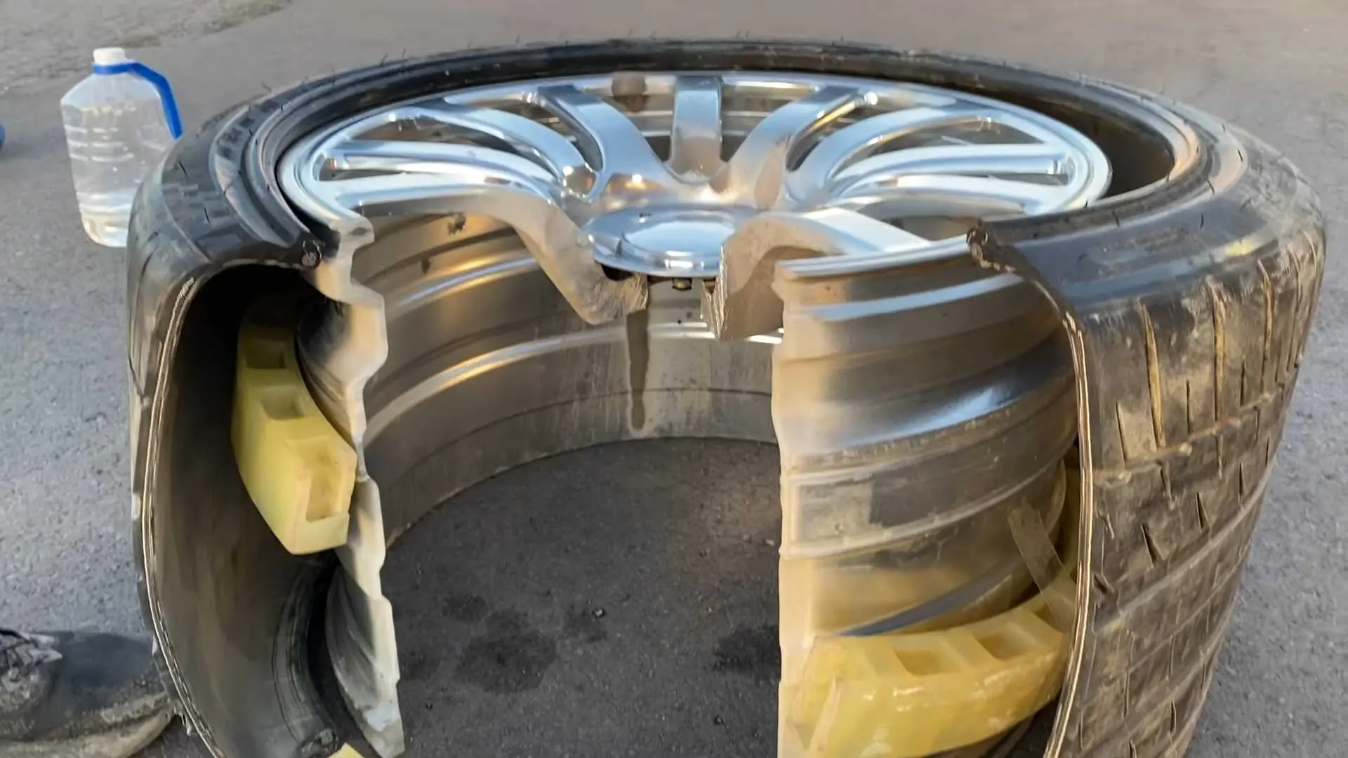Как видно на одном из кадров, пожертвовать блогеры решили шинами 2016 года. Распилить колесо (диск и резину) удалось примерно за 10 минут. На срезе видно внутреннее кольцо, которое позволит продолжить движение в случае разрыва шины. В целом все выглядит точно так же, как в обычных колесах.