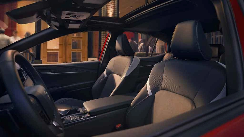 Спортивный стиль продолжается в салоне седана. Здесь установили сиденьями SofTex, отделанные черной искусственной кожей с контрастными белыми вставками, рулевое колесо в специальной оплетке из натуральной черной кожи, а на педалях появились алюминиевые накладки. В оснащение Camry входит 7-дюймовая цифровая приборная панель и мультимедийная система с 8-дюймовым экраном.