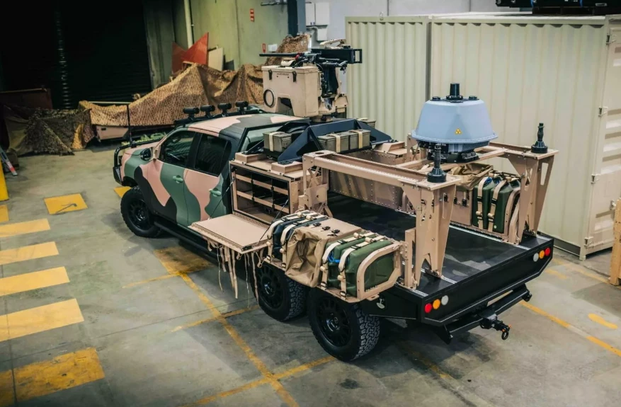 Специалисты удлинили шасси пикапа, установили новую грузовую платформу и интегрировали третью ось, сделав Hilux шестиколесным. Автомобиль дополнили стальными бамперами с дугами, светодиодной балкой на крыше, металлическими подножками, лебедкой, шноркелем и специальными надстройками на хранения снаряжения. А еще в грузовой платформе установили турель с пулеметом.