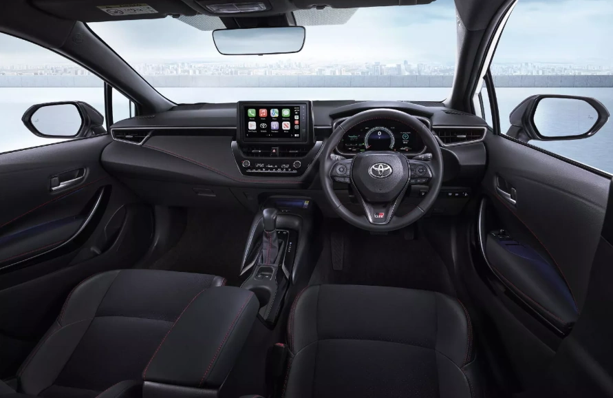 Салон Corolla Altis GR Sport отличается от остальной линейки модели отделкой из перфорированной кожи с красной контрастной строчкой, яркими ремнями безопасности, вставками Smoked Silver. На рулевом колесе и кнопке Start/Stop присутствует эмблема GR. В оснащение включили 12,3-дюймовую цифровую приборную панель и мультимедийную систему с 9-дюймовым экраном.