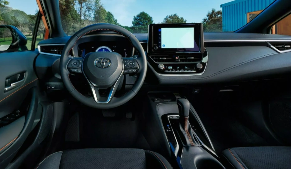 Салон ретро-версии Corolla FX отделан черной кожей с яркой оранжевой строчкой, которая присутствует на сиденьях, дверных картах, панели приборов, ручке переключения передач и рулевом колесе. Сами сиденья относятся к версии Sport Touring и имеют развитую боковую поддержку и встроенные подголовники. Есть в оснащении 7-дюймовая цифровая приборная панель и мультимедия с 8-дюймовым экраном, а еще слот для беспроводной зарядки смартфона.