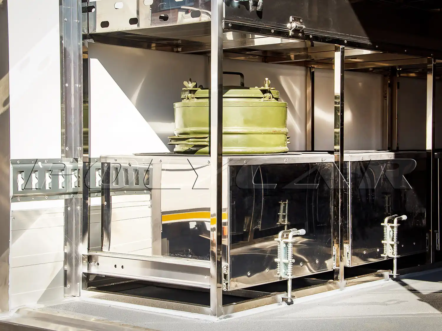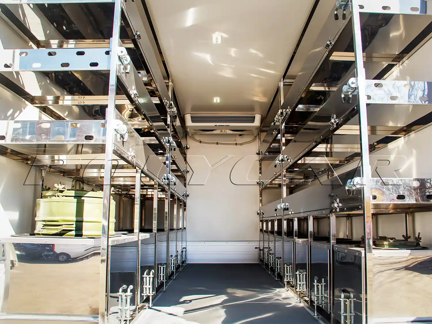 Внутри фургона смонтирована многоярусная система для перевозки груза, изготовленная из нержавеющей стали. Нижняя ее часть выполнена в виде выдвижных ящиков, в которых находятся емкие термосы. Ящики надежно фиксируются на ходу специальными фиксаторами.