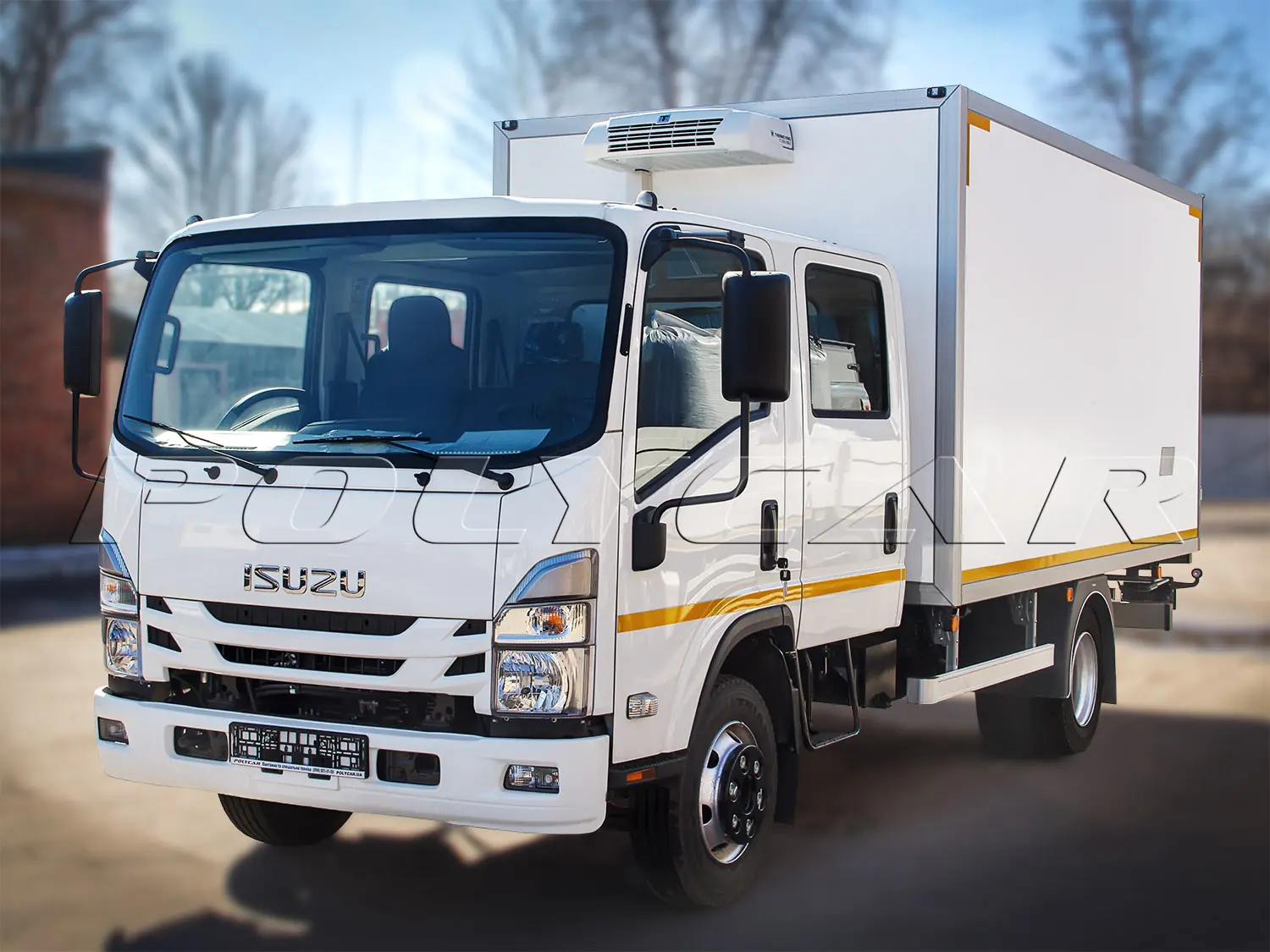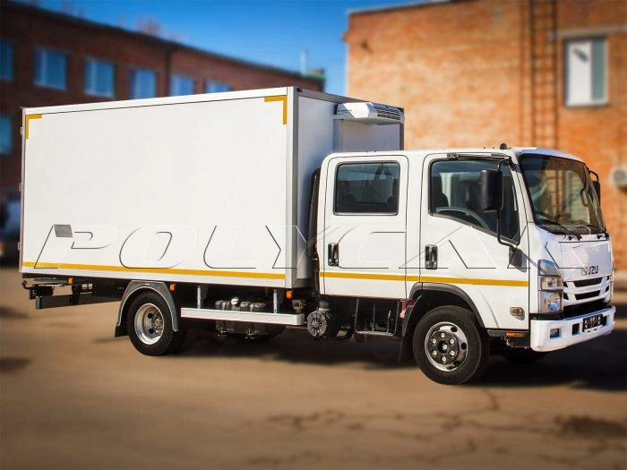 Здесь смонтирован безкаркасный фургон из стеклопластиковых сэндвич-панелей, между которыми находится 50-мм слой пенополистирола. Пол также имеет термоизоляцию. Надстройку удалось максимально облегчить благодаря использованию подрамника из алюминиевых профилей.