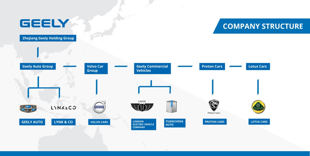 За последний год Geely Holding завершила несколько сделок по приобретению и поглощению, которые расширили глобальное присутствие Группы. Так была приобретена американская компания Terrafugia, которая занималась разработкой и производством летающих автомобилей, а также 51% контрольного пакета акций британской компании Lotus, культового бренда спортивных автомобилей и 49,9% акций малазийского автопроизводителя Proton. Также Группа осуществила стратегическое инвестирование в датский инвестиционный банк Saxo Bank и в шведский концерн коммерческих автомобилей АВ Volvo. Кроме того, Geely стала самым крупным держателем акций немецкой автомобильной корпорации Daimler AG.