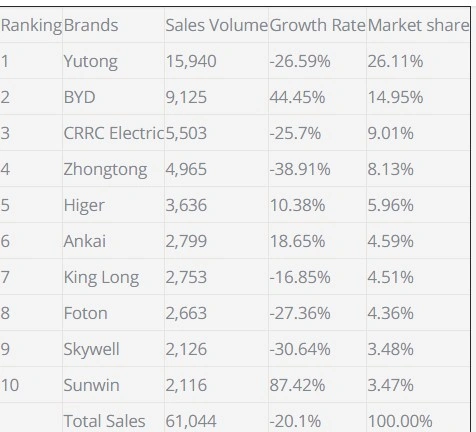 Лидером китайского автобусного рынка стала компания Yutong. В 2019 году она продала 58 688 автобусов по всему миру, что на 11% меньше, чем годом ранее.