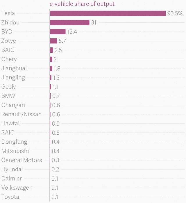 Как видите, до сих пор лидером продаж электромобилей является Tesla, за которой с большим отрывом следуют китайские автопроизводители. Доля же таких гигантов, как BMW, Daimler, Volkswagen и Toyota пока ничтожна.