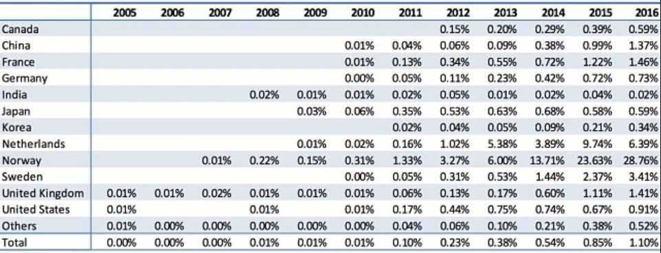 На конец 2016 года в Норвегии 60% продаваемых новых автомобилей являлись электрическими. И на сегодняшний день в рейтинге "какая из стран лидирует по количеству электромобилей" она занимает первое место. Почти 30% всех авто на дорогах этой страны - электро и гибридный транспорт. При этом, в Китае, с его государственной поддержкой автопроизводителей и покупателей, этот показатель только надеются довести до 11% к 2020 году.