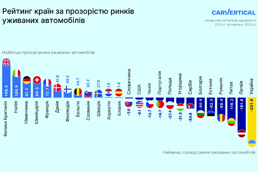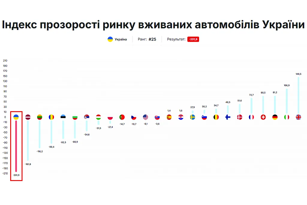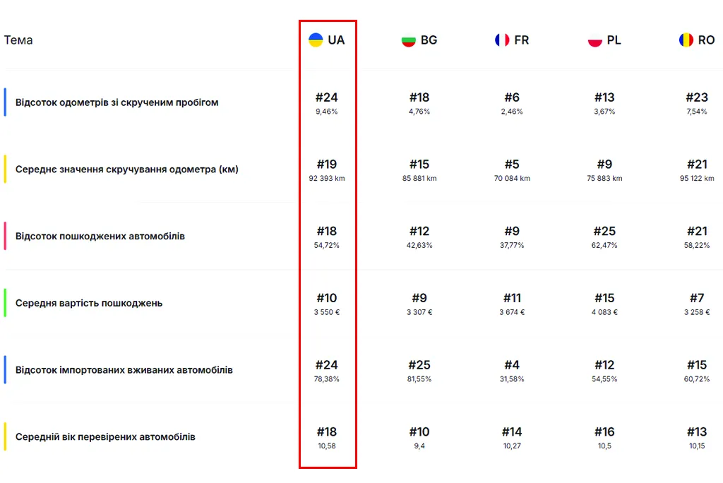 П’ятірка найменш прозорих країн залишається незмінною з минулого року. Україна посідає останнє місце. Перед нею йдуть Латвія, Литва, Румунія та Естонія. Ці ринки мають спільні риси: значна частка імпортованих авто, старіший автопарк, поширене скручування пробігу й висока кількість авто з пошкодженнями.