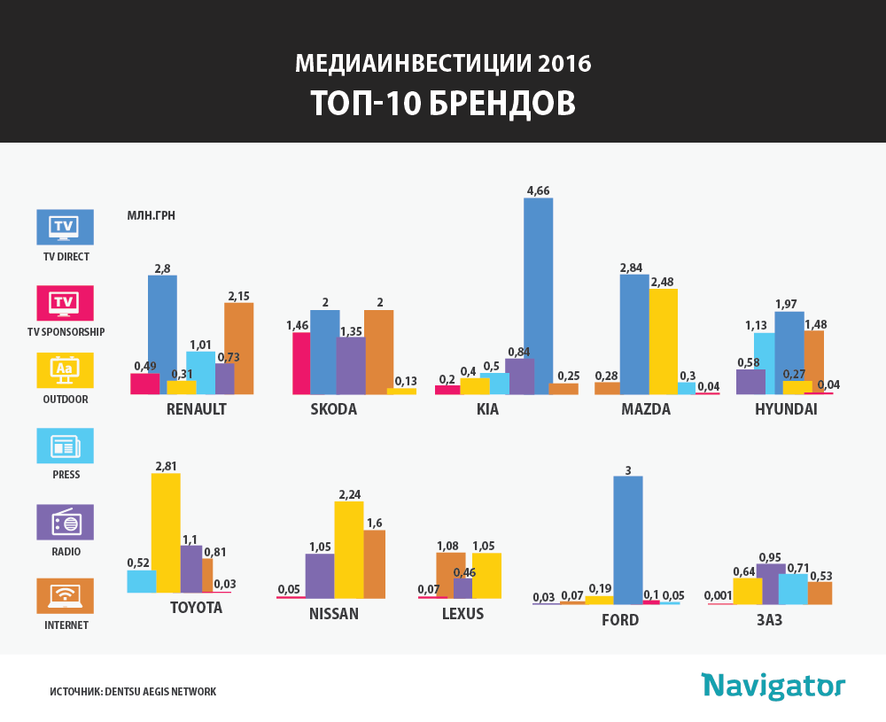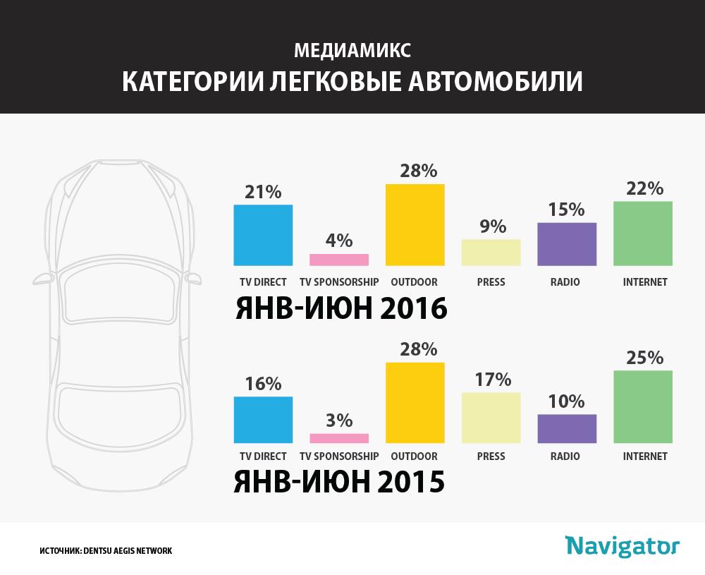 «Рекламная активность какой-либо категории является ярким показателем ситуации на рынке. Поэтому можно с уверенностью сказать о начале «выздоровления» авторынка в Украине. В 2016 году медиаинвестиции категории легковых автомобилей демонстрируют рост в сравнении с прошлым годом», – прокомментировал Олег Пличко. «Для коммуникации производители используют медиамикс, аналогичный прошлому году, но с большим акцентом на прямую рекламу и радио, наружная реклама по-прежнему остается основным каналом коммуникации, занимая около 30% инвестиций».