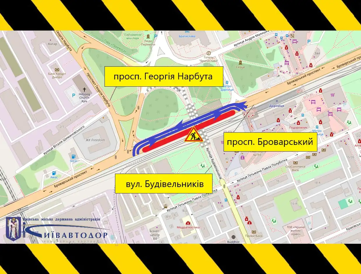 Коммунальная корпорация «Киевавтодор» извиняется за временные неудобства и просит учитывать ограничения при планировании маршрута.