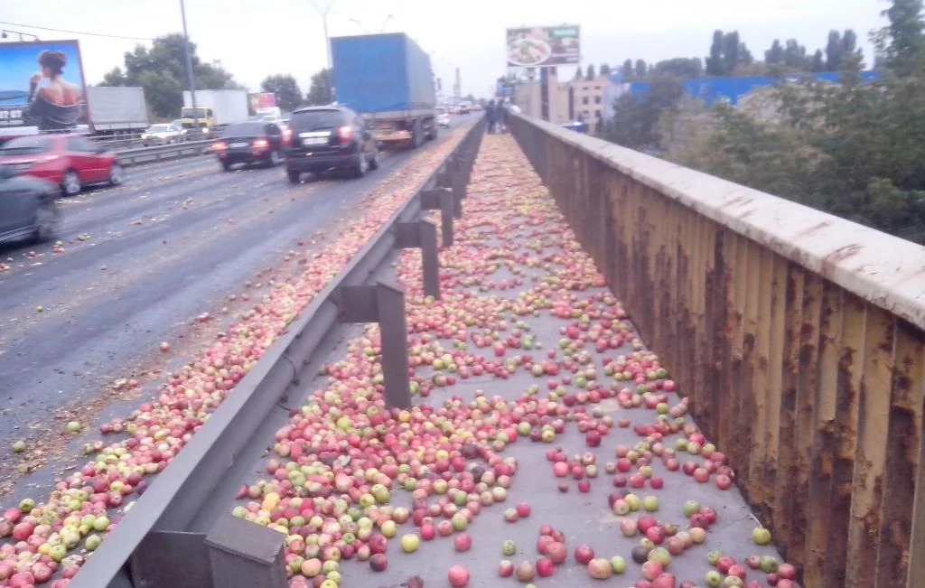 Причиной столь необычного зрелища стала фура, из которой высыпались тысячи яблок. Как пишут случайные свидетели, у грузовика открылась задняя дверь. В итоге, на Южном мосту образовался затор.