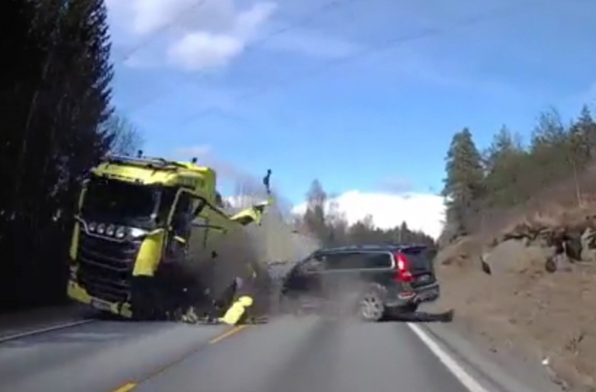 Это видео засняли недалеко от норвежского городка Сарпсборг. На загородной трассе универсал Volvo XC70 выдержал лобовое столкновение с грузовиком Scania на скорости около 62 км/ч.