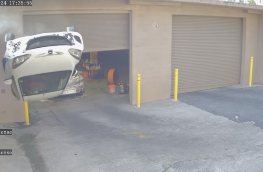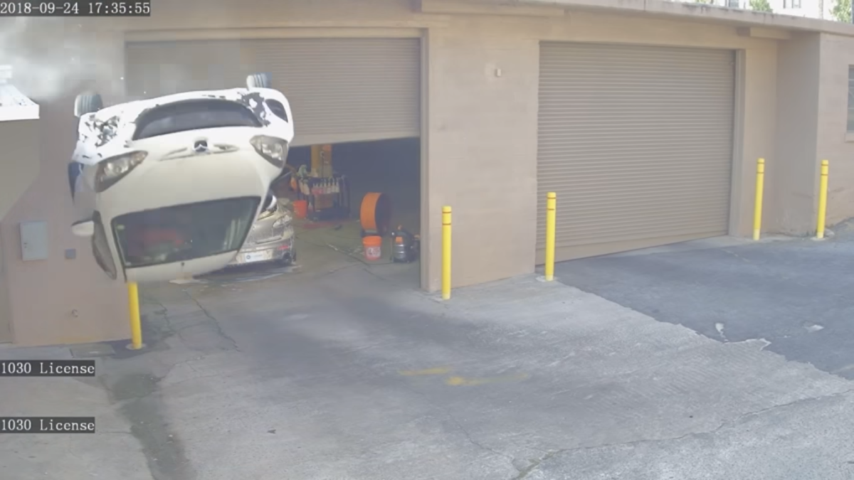 У водителя застряла нога между педалями акселератора и тормоза, что обернулось нешуточным ДТП. В опубликованном видео можно увидеть, как автомобиль резко съезжает на парковку, а затем с нее вылетает, падая и переворачиваясь на дорогу, которая находится на уровень ниже (к счастью, не на магистраль, а пригаражную территорию).