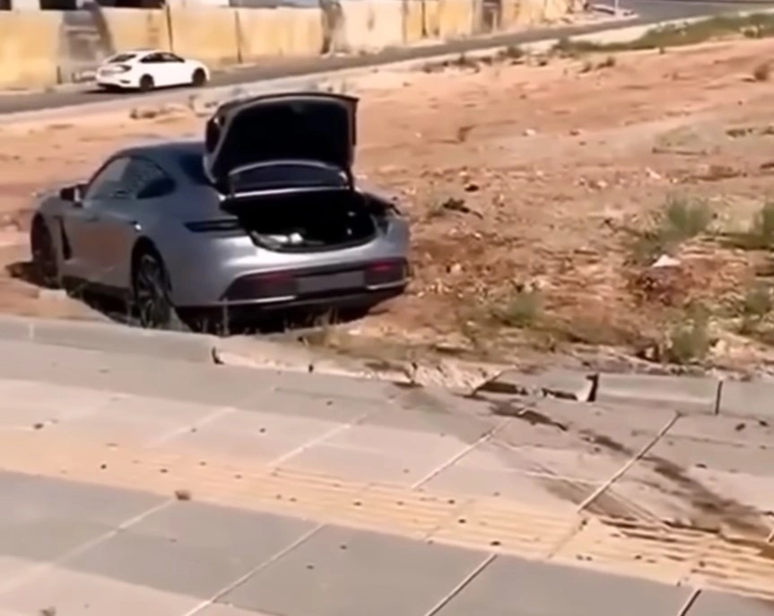 В результате мы услышали еще больше криков (уже не настолько восторженных), хруст и многочисленные скрипы, увидели поврежденный газон и разбитый каменный тротуар. Электрическому Порше Тайкан Турбо повредили бампер и, скорее всего, разбили подвеску.