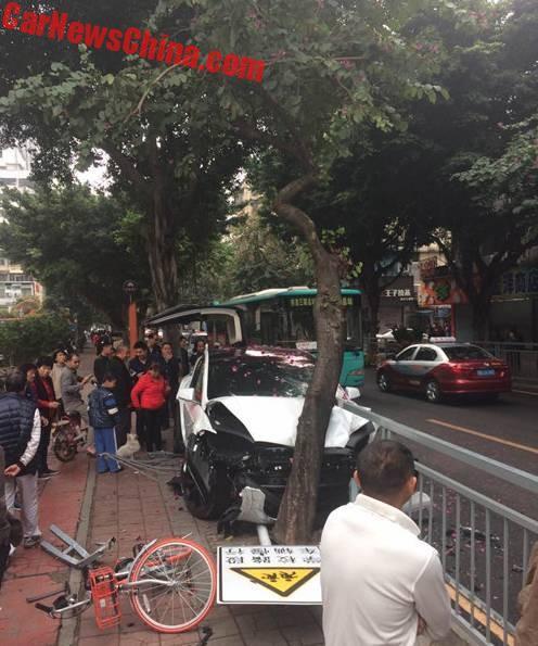 Впрочем, как бы то ни было, а машине в этом ДТП досталось изрядно. Кроме пробитого стекла, у нее еще повреждена передняя часть, которую смяло от удара об дерево. Если электрокар и подлежит восстановлению, наверняка ремонт будет дорогостоящим.