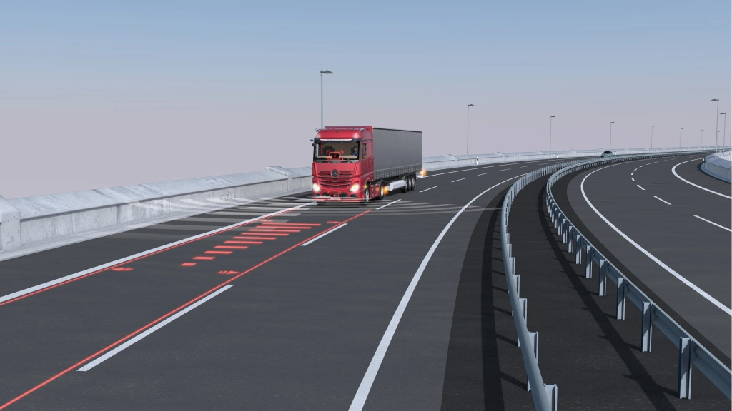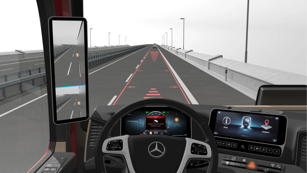 Напомним, что она помогает водителю следовать по заданной полосе движения, корректируя управления по дорожной разметке – причем не только по прямой, но и в пологих поворотах, а также поддерживать безопасную дистанцию до впереди идущих транспортных средств. Это, можно сказать, «полуавтопилот», ведь водитель все равно обязан держать руки на руле. Mercedes-Benz и здесь стал первым в мире, кто установил такого «ассистента» на грузовые автомобили.