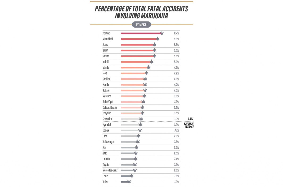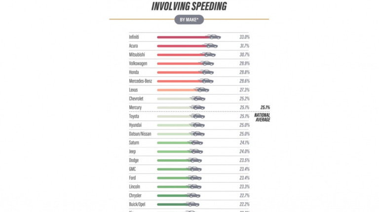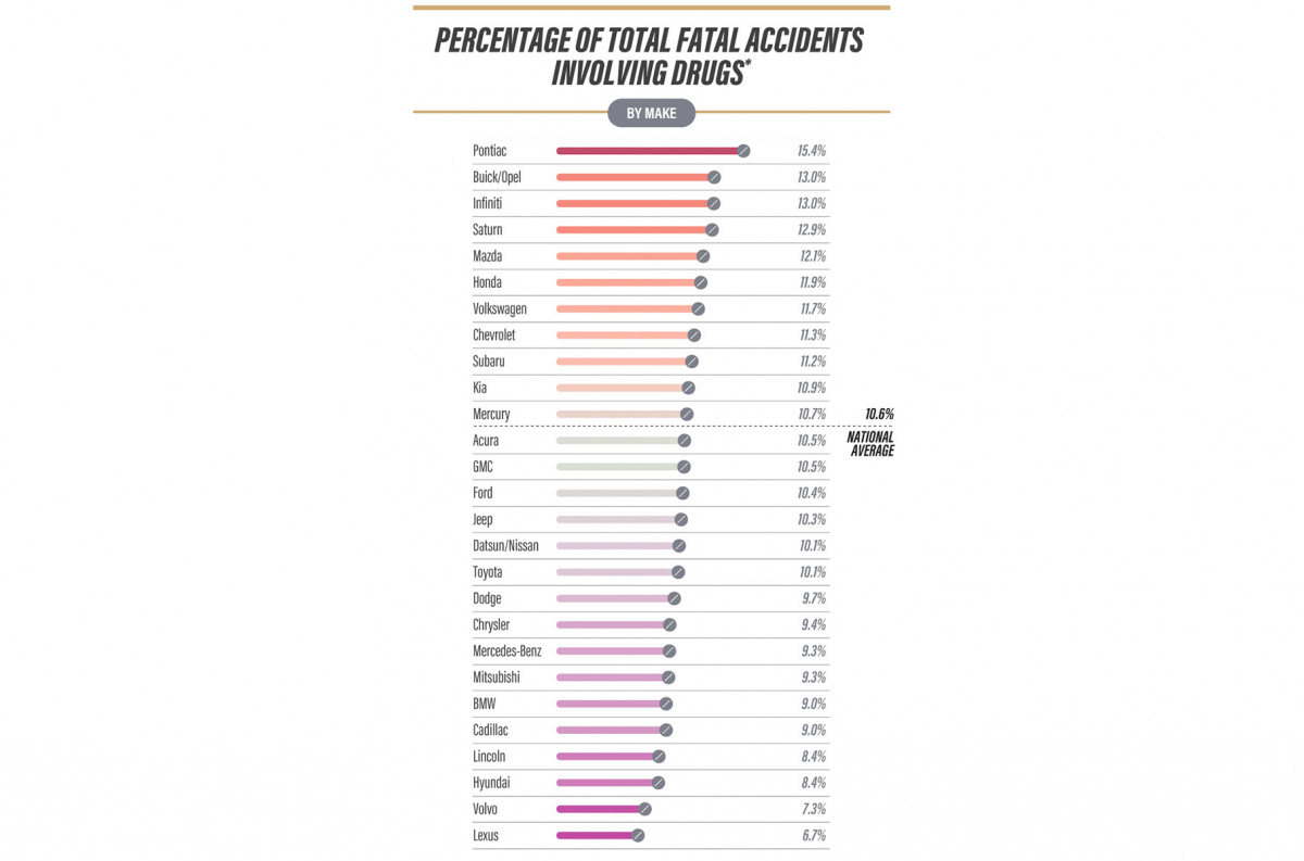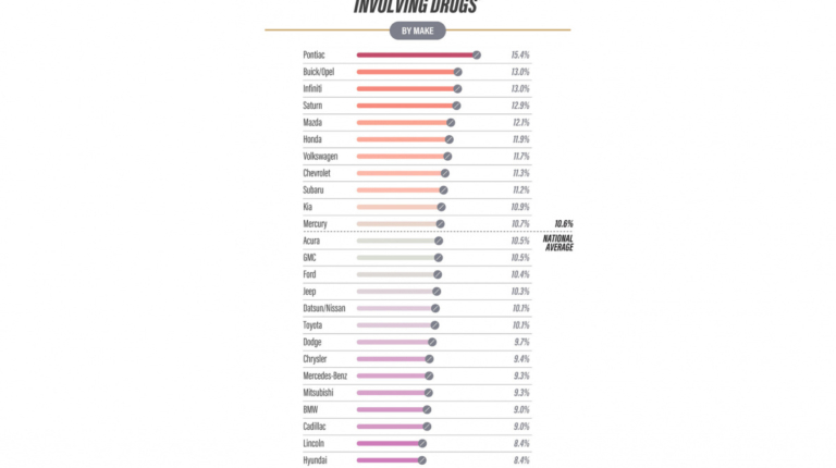 В итоге, выяснилось, что водители Infiniti умудрились попасть в топ сразу трех рейтингов, при этом возглавив “скоростной” и “алкогольный”. Под легкими и тяжелыми наркотиками предпочитают ездить владельцы уже давно ликвидированного бренда Pontiac. Также почти во всех первых топ-тройках заметен еще один японский премиум-бренд – Acura.