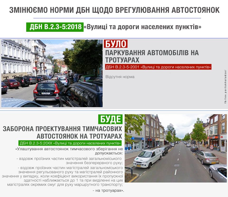 Новые Государственные строительные нормы Украины (ГСНУ) В.2.3-5:2018 запрещают проектирование автостоянок временного хранения, в частности, на тротуарах. Этот же запрет касается и проезжей части, например, узких дорог с полосой для общественного транспорта или больших развязок на магистралях. Об этом сообщил заместитель министра Регионального развития, строительства и жилищно-коммунального хозяйства Украины Лев Парцхаладзе на своей страничке в Фейсбук.