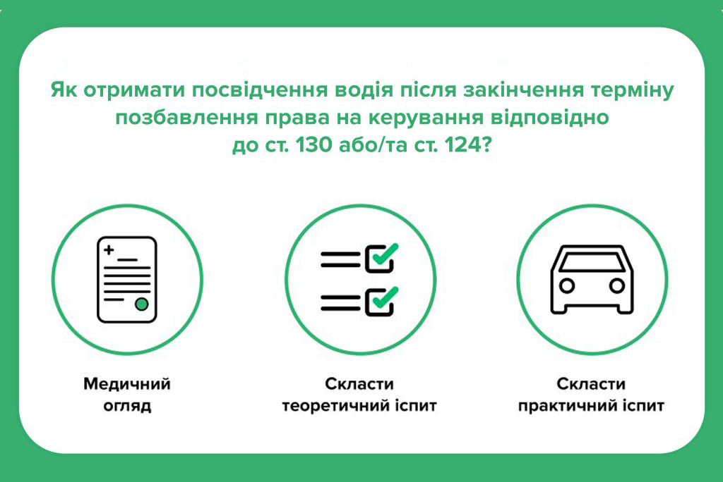 Посвідчення водія видане вперше на 2 роки під час вчинення порушення за ст. 130 та ст. 124, не повертають. Для відновлення права керування транспортним засобом необхідно освоїти теоретичну частину навчання в автошколі або самостійно та скласти теоретичний іспит в сервісному центрі МВС. Далі пройти практичну підготовку в акредитованому навчальному закладі та скласти практичний іспит у сервісному центрі МВС. За умови успішного складання іспитів, посвідчення водія знову видається на 2 роки.