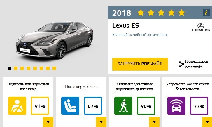 Седан Лексус отлично проявил себя во всех тестах, за исключением одного: при лобовом ударе манекен заднего пассажира поднырнул под ремень безопасности, что серьезно ухудшило защиту тазовой области. Однако это не помешало получить 5 звезд.