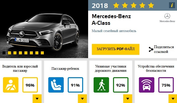Новый Mercedes A-Class показал высокий уровень защиты как взрослых, так и детей, хорошо проявили себя и электронные системы активной безопасности. Закономерный результат – 5 звезд.