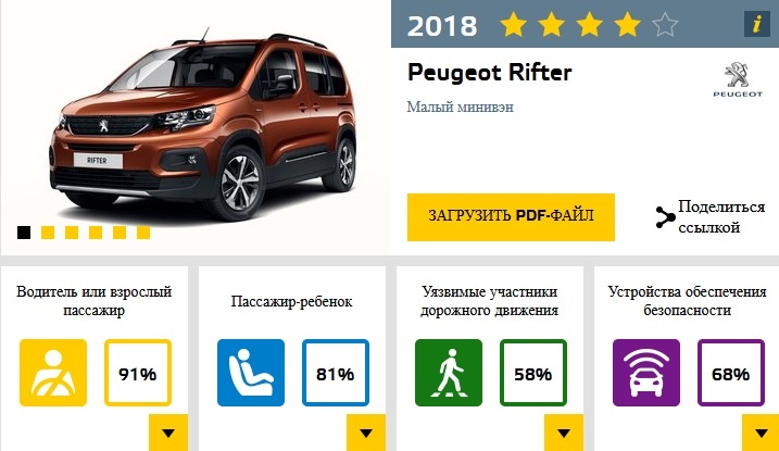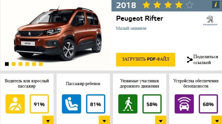 Трио минивэнов являются близкими «родственниками», а потому для всех их взят результат Peugeot Rifter. Автомобиль демонстрирует хорошую защиту водителя и пассажиров, но потерял баллы за безопасность пешеходов и электронные «помощники», поэтому получил 4 звезды.