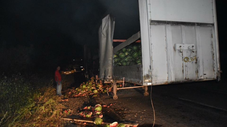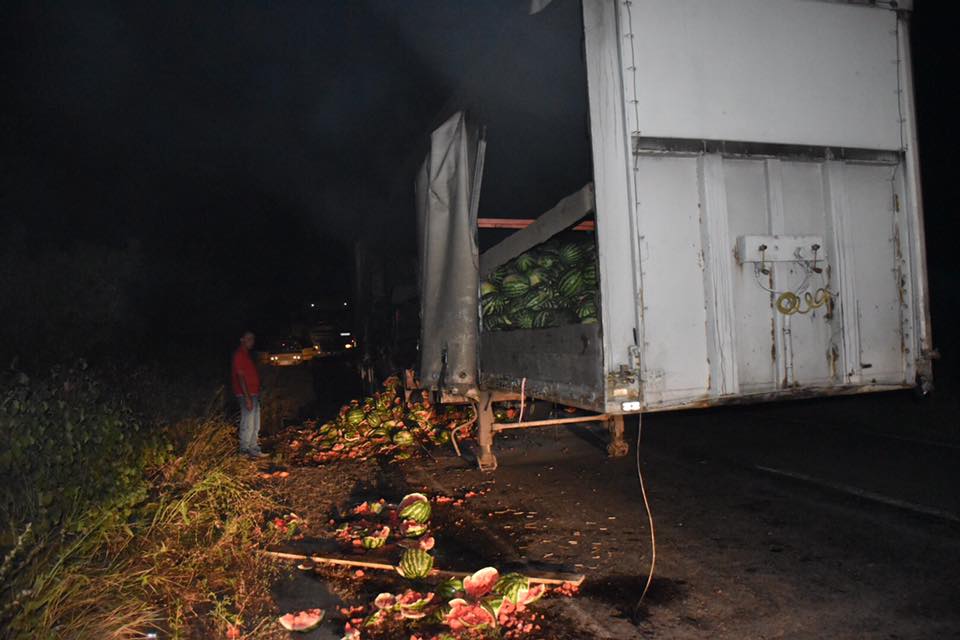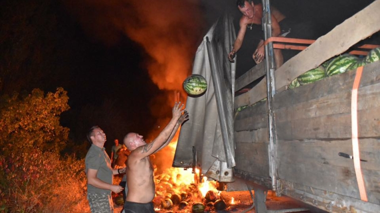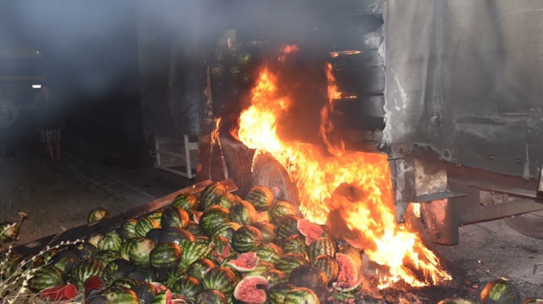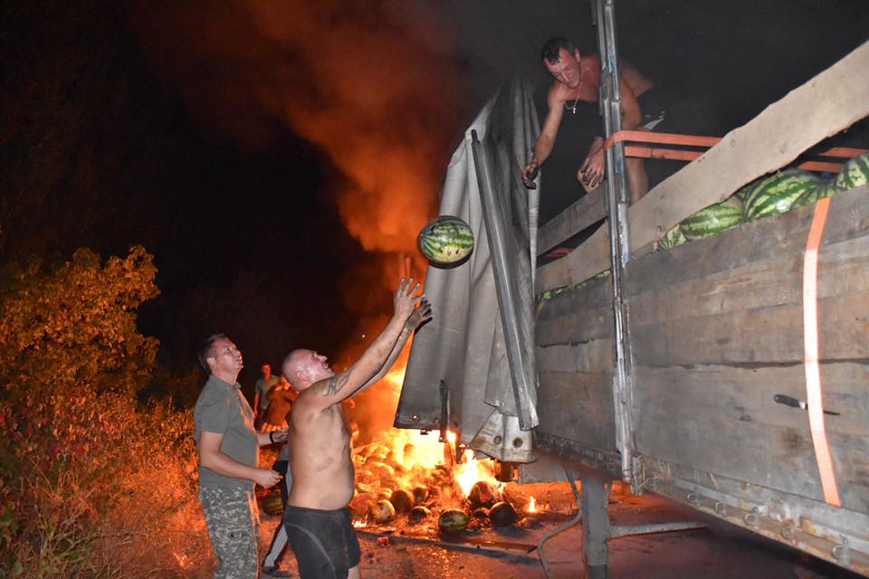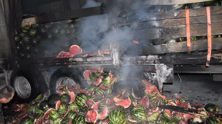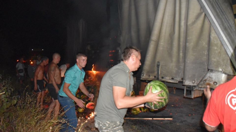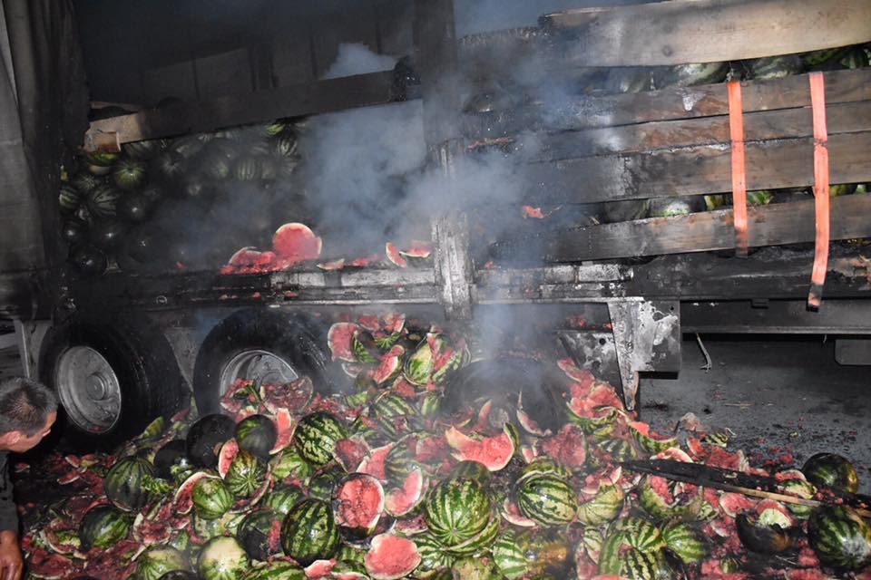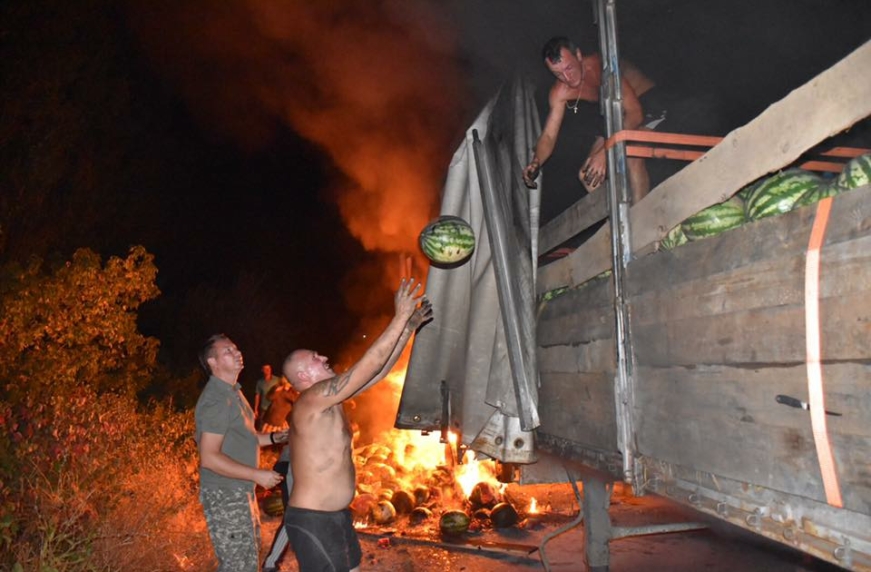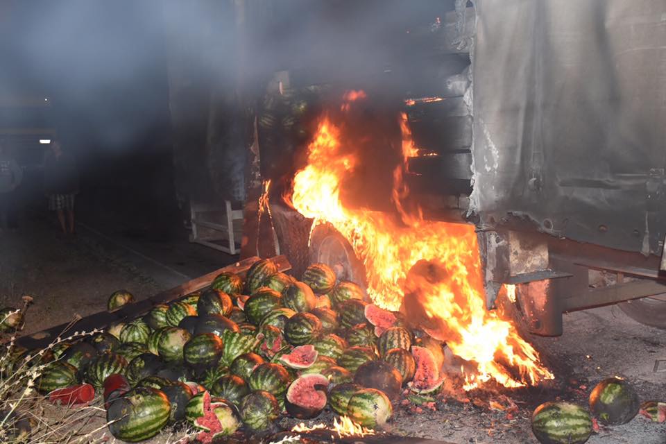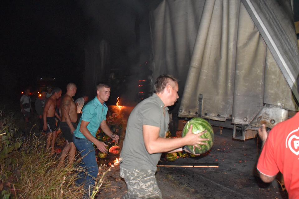 В дело пошли арбузы, которыми оказалась забита несчастная фура. Передавая по цепочки сочные плоды к пылающим шинам полуприцепа, огонь удалось быстро потушить. Вот как прокомментировал этот инцидент на свой страничке в Фейсбук губернатор Херсонской области, Андрей Гордеев, который принимал участие в тушении пожара: