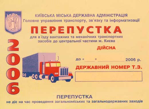 В центр столицы грузовым автомобилям, не имеющим специальных пропусков, въезд заказан. Правда, у многих водителей пропуска все же имеются. Одни получили их в столичной ГАИ – подобные пропуска не новинка, их ввели в Киеве еще в 2000 году. Другие обратилась в Главное управление транспорта столичной горгосадминистрации. За прошедший месяц Управление выдало 228 пропусков. Правда, документы, разрешающие въезд в центр Киева, в отличие от выдаваемых ранее ГАИ, действительны только на один месяц, а затем их нужно будет продлевать.
