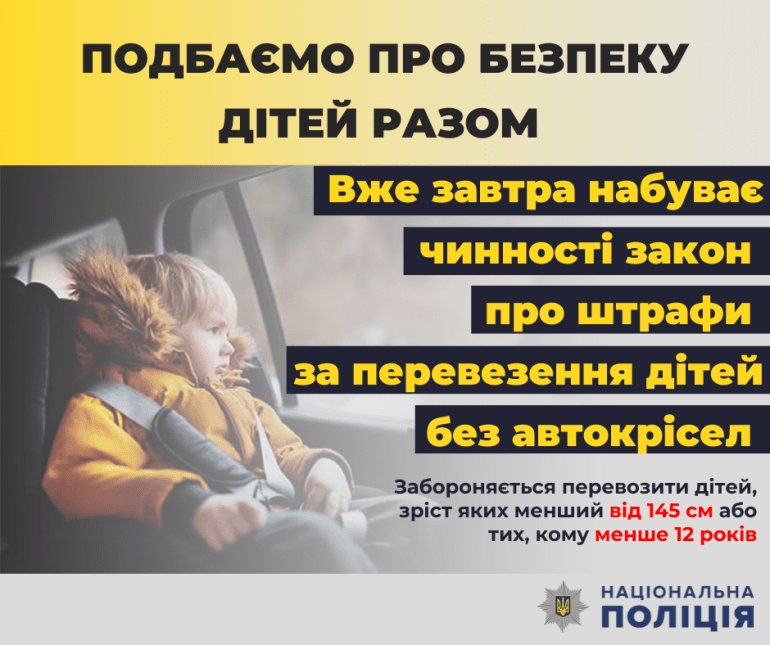 Новый закон дополняет статью 121 Кодекса Украины об административных правонарушениях и касается перевозки детей автомобильным транспортом. В подпунктах «б-г» пункта 21.11 Правил дорожного движения определено, что запрещается перевозить детей, рост которых меньше 145 сантиметров или тех, которые не достигли 12-летнего возраста в транспортных средствах, оборудованных ремнями безопасности, без использования специальных средств, которые дают возможность пристегнуть ребенка с помощью ремней безопасности, предусмотренных конструкцией этого транспортного средства; детей до 16-летнего возраста в кузове любого грузового автомобиля; организованные группы детей в темное время суток. И если раньше за это нарушение было лишь предупреждение, то теперь – денежное взыскание.