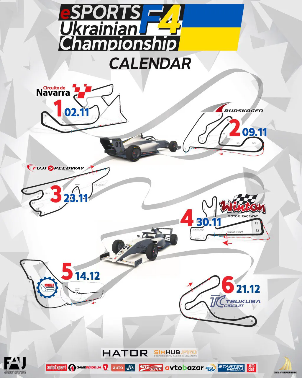 Залік Чемпіонату Україну проходить в рамках Міжнародного відкритого Чемпіонату з Формули-4 «ESPORTS UKRAINIAN F4 CHAMPIONSHIP» що проводиться КЦА ФАУ.