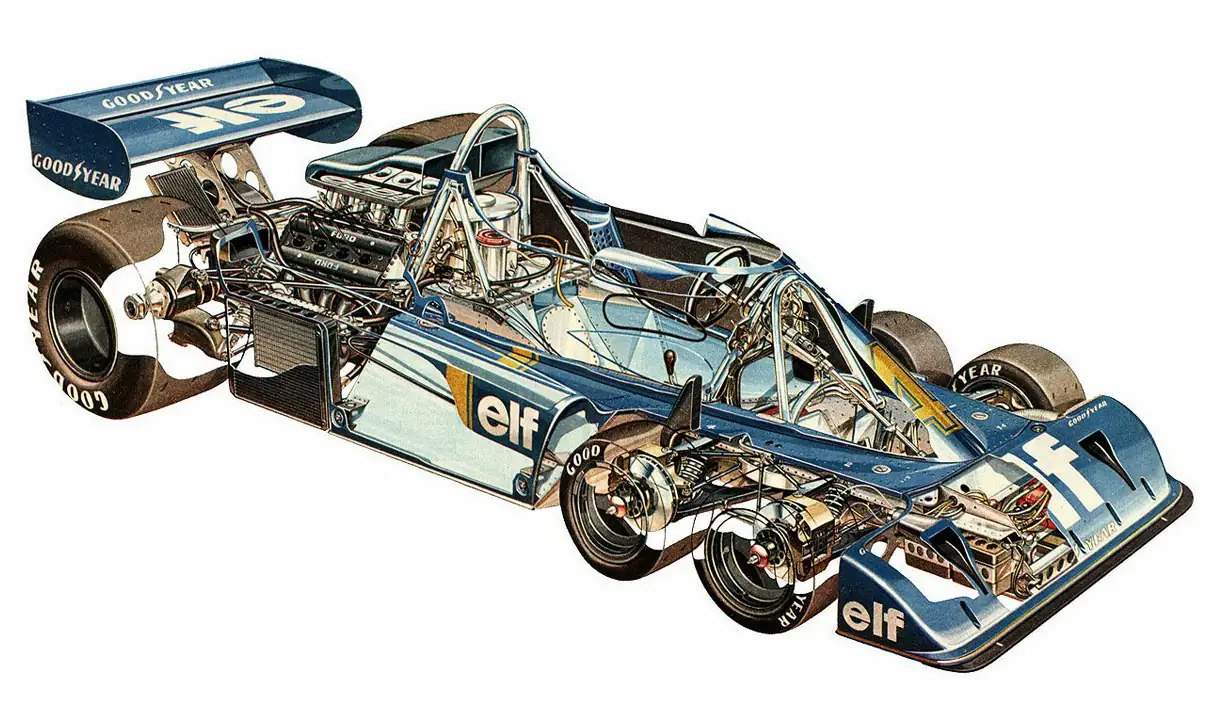 Конструктор автомобиля Tyrrell P34-Ford Дарек Гартнер искал способы уменьшить аэродинамическое сопротивление машин «Формулы 1». Для этого он решил установить спереди не два управляемых колеса, как обычно, а четыре, но зато меньшего диаметра – 10 дюймов (250 мм). И теперь они не выступали над плоскостью передней части кузова, улучшая его обтекаемость.