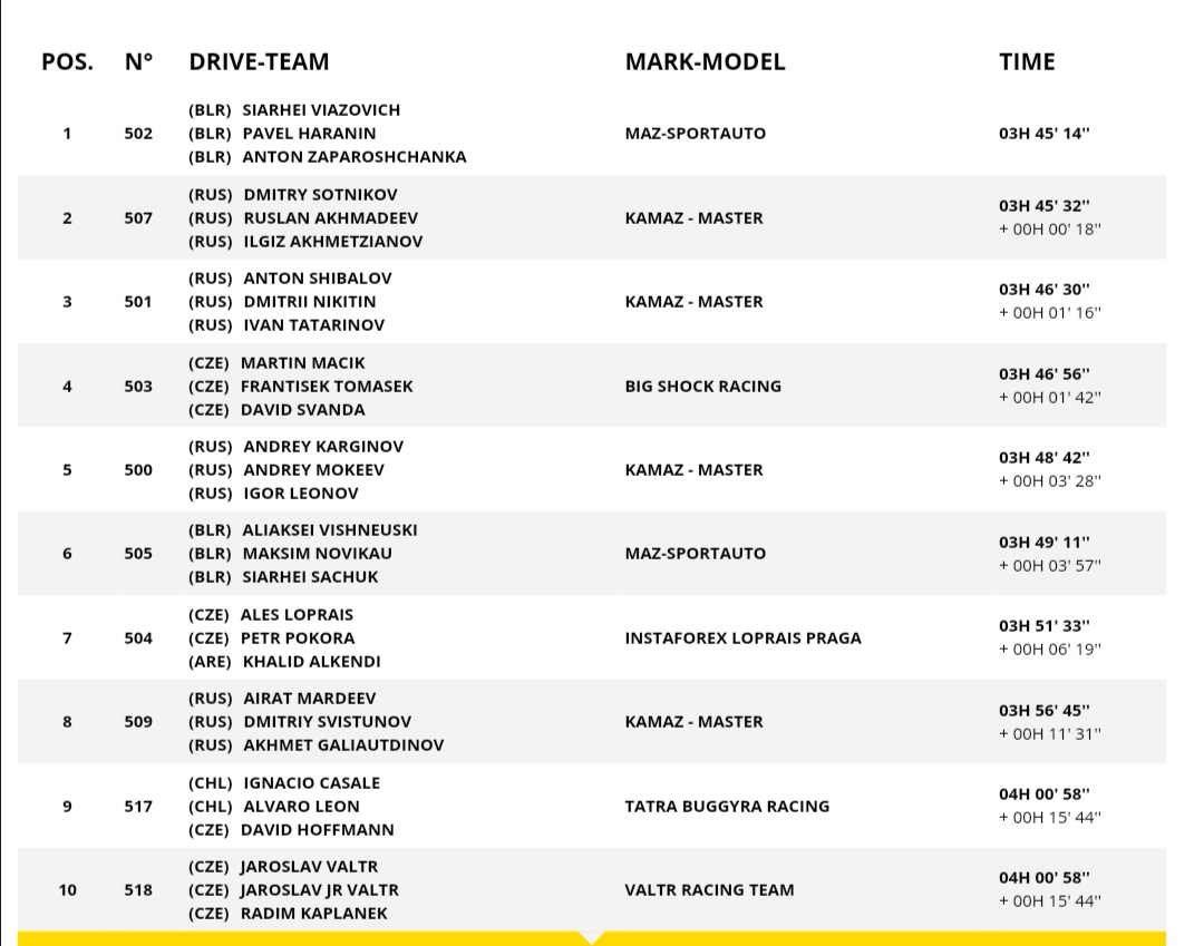 Сергей Вязович потратил на трассе 3 часа 45 минут. Борьба была напряженной: занявший второе место «камазовец» Дмитрий Сотников проиграл всего 18 секунд. На третьем месте – его партнер по команде Антон Шибалов с более чем минутным отставанием. МАЗ Алексея Вишневского пришел шестым, потратив на спецучастке почти 4 минуты больше самого быстрого «зубра».