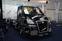 На недавнем автосалоне в Ганновере был показа необычный болид для кольцевых гонок на грузовиках – трак-рейсингу. За основу машины было положено шасси развозной модели IVECO Daily, включая кабину. Правда, его основательно перекроили. Двигатель установили позади кабины. Да еще какой – 12-литровый битурбо Mercedes-Benz, выдающий на гора 1600 (!) л.с. С ним агрегатируется и соответствующая механическая коробка передач, имеющая в арсенале две дюжины передач! Болид обут в специальные низкопрофильные покрышки марки Hankook. А теперь самое интересное. Махина, весящая без малого 3500 кг, разгоняется от 0 до 200 км/ч менее чем за 10 секунд.