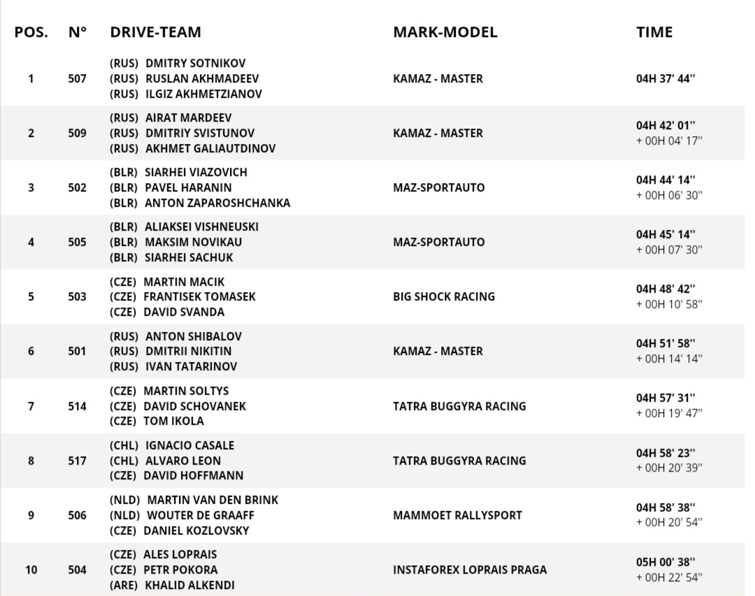 Пятёрку лидеров как и накануне замыкает Мартин Масик от BIG SHOCK RACING, выступающий на IVECO. Он уступил лидеру 10 мин. 58 сек.