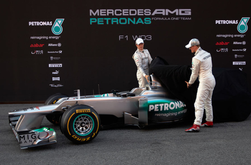 И вот, во вторник 21 февраля, в Барселоне, Михаэль Шумахер и Нико Росберг сняли покрывало со своего нового болида Mercedes W03.