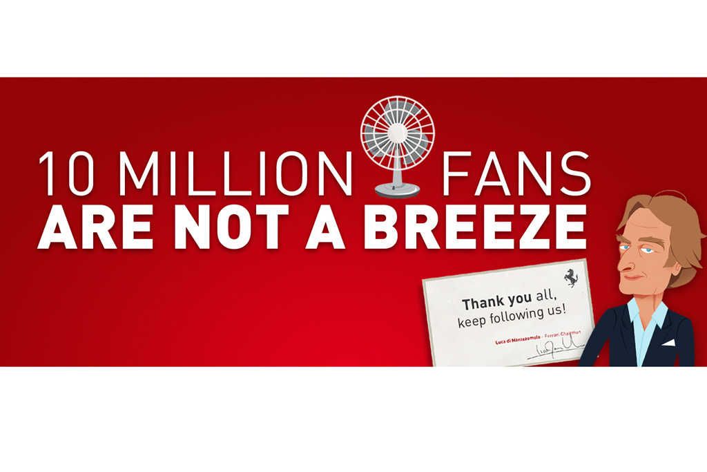 В основу анимационного поздравительного ролика легло слово «фан», которое с одной стороны переводится как фанат, в данном случае – фанат Ferrari, а с другой стороны имеет и значение «вентилятор». В итоге, по сюжету, под действием 10 миллионов «вентиляторов» сдувает и Фелипе Массу, и Фернандо Алонсо, и Луку ди Монтедземоло, и даже красный автомобиль Ferrari. При этом пикантность мультяшному посланию Ferrari придает тот факт, что на протяжении всего сезона болидам «красных» постоянно не хватало скорости по причине проблем с аэродинамической трубой. Как признавали и в самой итальянской команде, из-за ошибок в калибровке, те новинки, которые разрабатывались и испытывались в трубе, на практике работали совсем не так, как того от них ожидали.