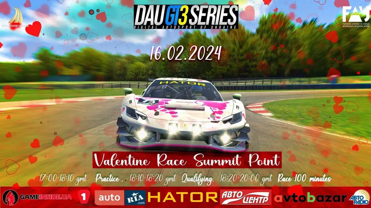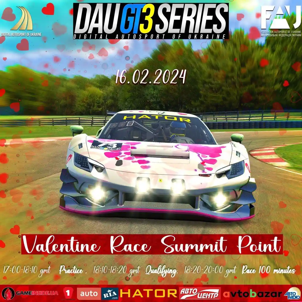 КЦА ФАУ запрошує на ТРЕТІЙ етап VALENTINE RACE SUMMIT POINT у Міжнародній Серії змагань на автомобілях класу GT3 під назвою DAU GT3 Series (DIGITAL AUTOSPORT OF UKRAINE: GT3 solo endurance Series-2024. Season 1) на симуляторі iRacing.