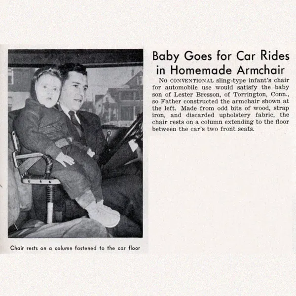 1935 год. В журнале Modern Mechanix (США) была опубликована небольшая информационная заметка. Эта статья рассказывала об изобретении, которое помогало фиксировать ребёнка в домашних условиях. Некий аналог современному «стульчику для кормления». Помимо домашней эксплуатации этого приспособления, предполагалось его использование в автомобиле. Изобретателей этого приспособления интересовал прежде всего один вопрос, как зафиксировать ребёнка в одном положении, чтобы он не мешал взрослым дома и в салоне автомобиля. Для заинтересованности ребёнка на кресло, которое крепилось на металлический прут, монтировали игрушечную голову лошади.