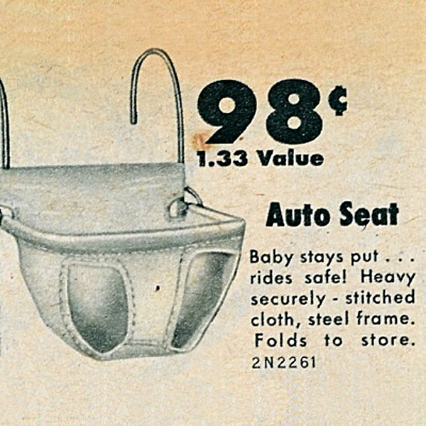 1940-е года. Удивительно, но факт остаётся фактом. Внимательный читатель, наверняка, уже заметил одну нить, связующую все эти приспособления. С завидным упорством инженерная мысль изобретателей «усаживала» ребёнка на переднее пассажирское сиденье. И никто ещё не понимал, что расположение ребёнка на заднем диване автомобиля, является более безопасным. Но в то время всё было направлено на то, чтобы надёжно зафиксировать ребёнка, исключая помеху водителю со стороны детей. Реклама 40-х: «Автомобильное сидение. Ребенок остается на месте, путешествует в безопасности! Весьма надежно — прочно прошитая ткань, стальная рама. Складывается для хранения».