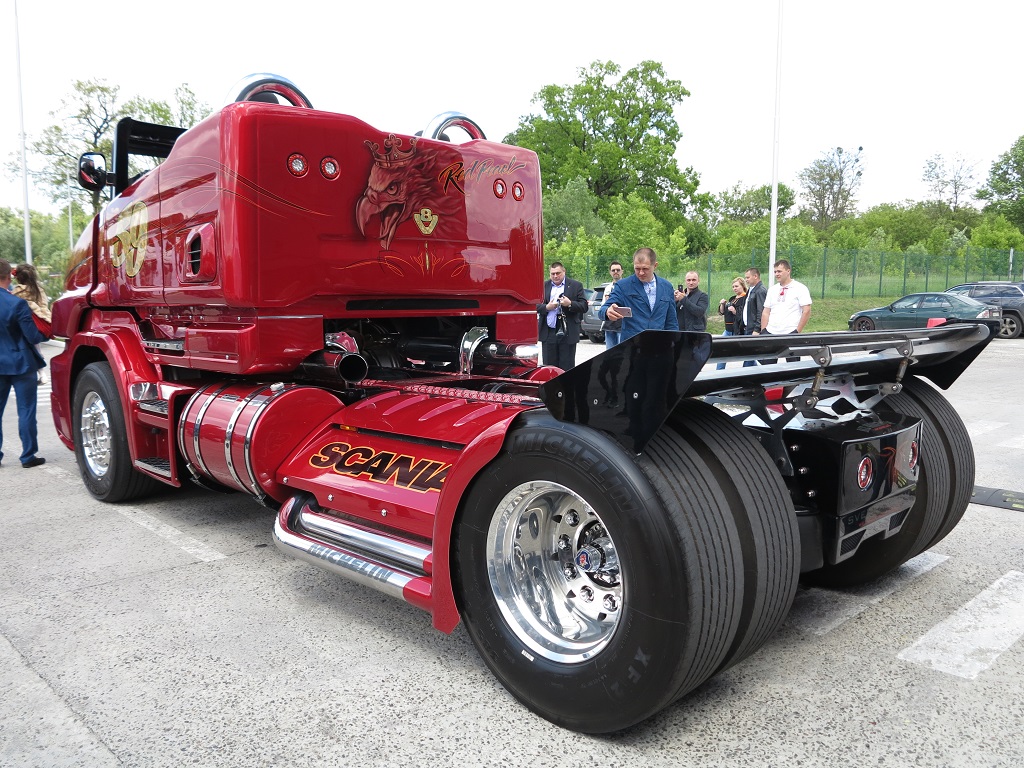 На этом красивом грузовке Scania привезли уникальный хот-род Красная Жемчужина, построенный в единственном экземпляре.