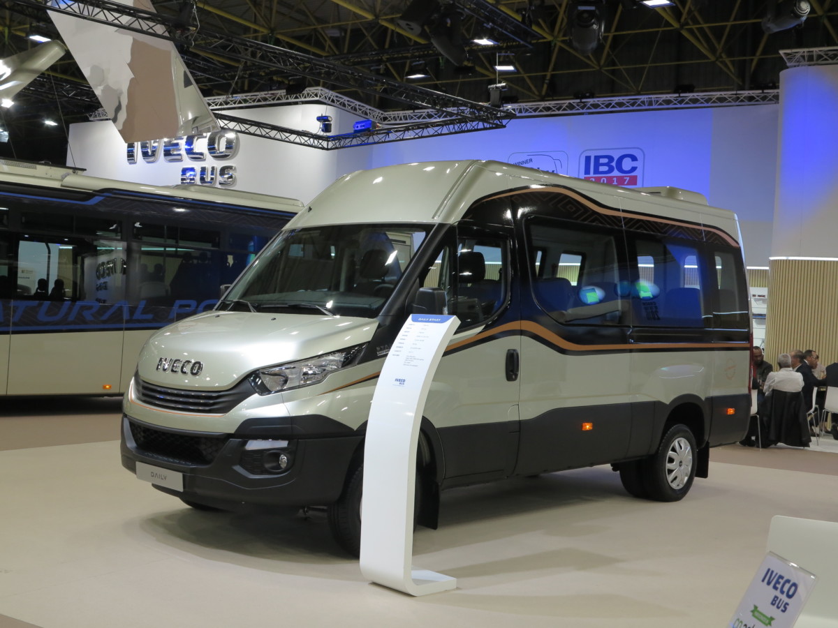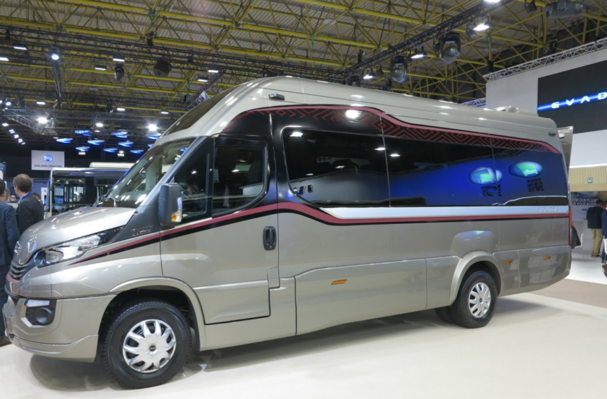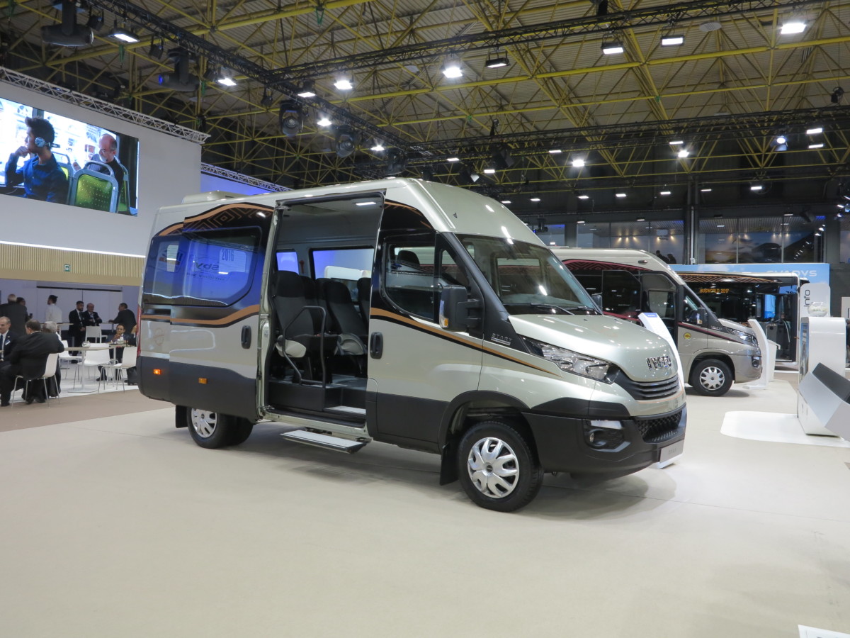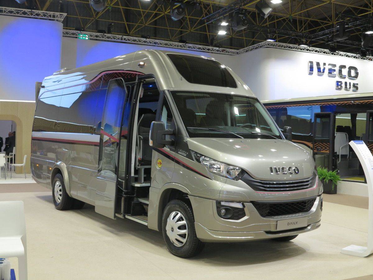 Первая – это туристический автобус малого класса IVECO Daily Tourys. Его длина 7498 мм, ширина – 2174 мм и высота 3100 мм. Внешне машина отличается панорамным лобовым стеклом площадью 2,5 м кв с эффектной верхней вставкой, молдингами под алюминий на бортах и эффектной окраской.
