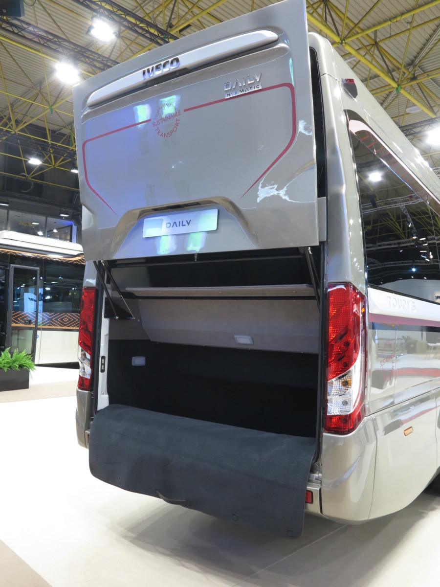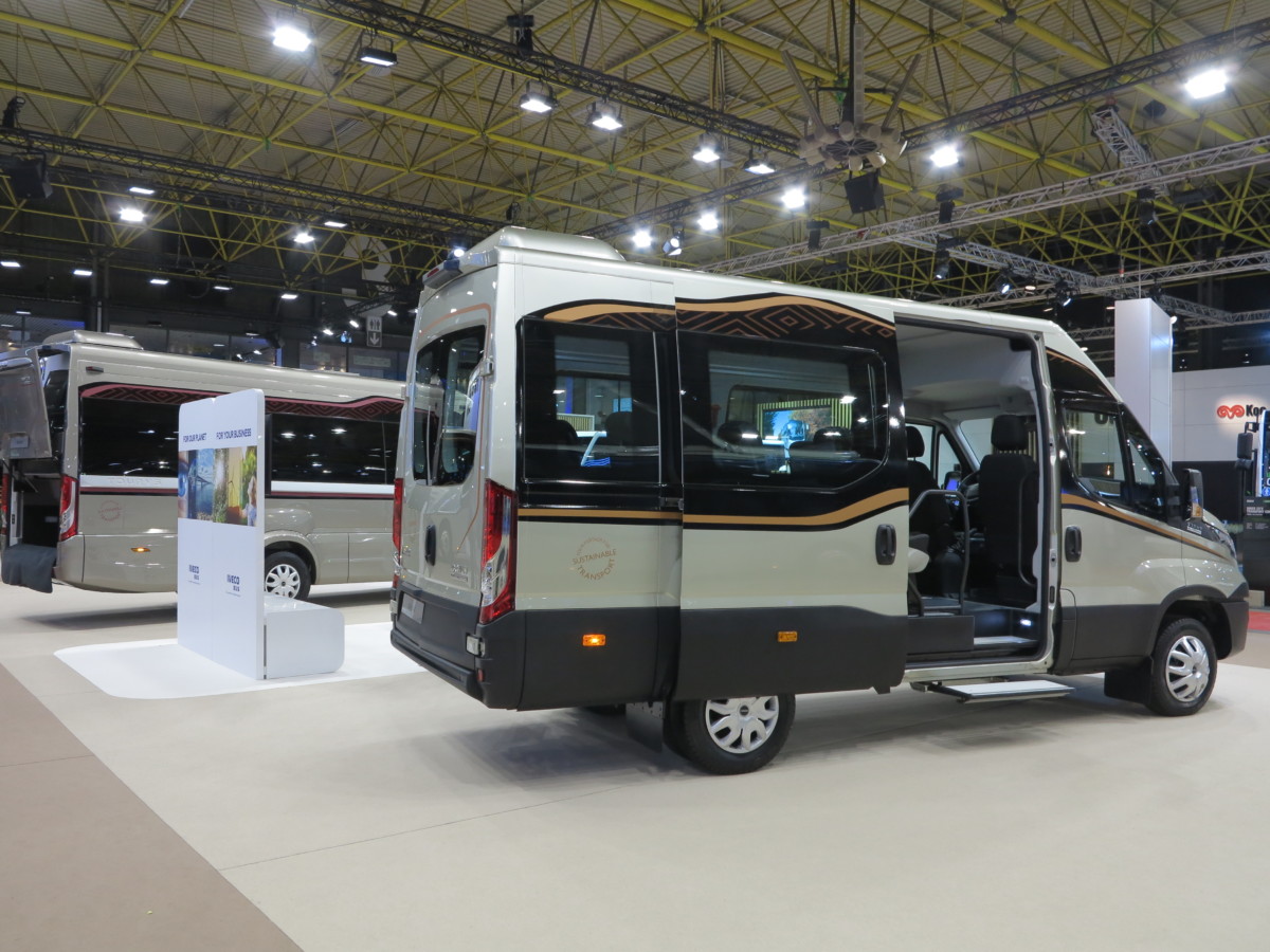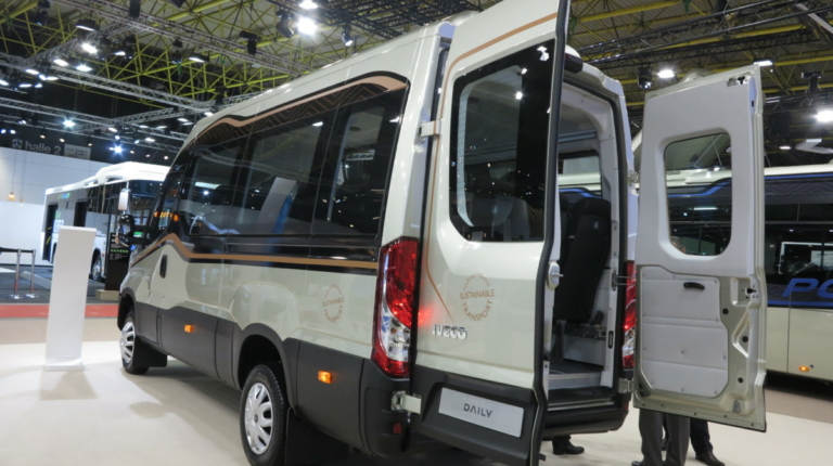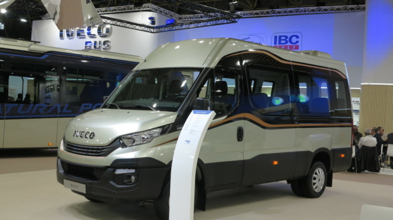 Первая – это туристический автобус малого класса IVECO Daily Tourys. Его длина 7498 мм, ширина – 2174 мм и высота 3100 мм. Внешне машина отличается панорамным лобовым стеклом площадью 2,5 м кв с эффектной верхней вставкой, молдингами под алюминий на бортах и эффектной окраской.