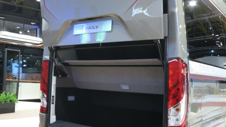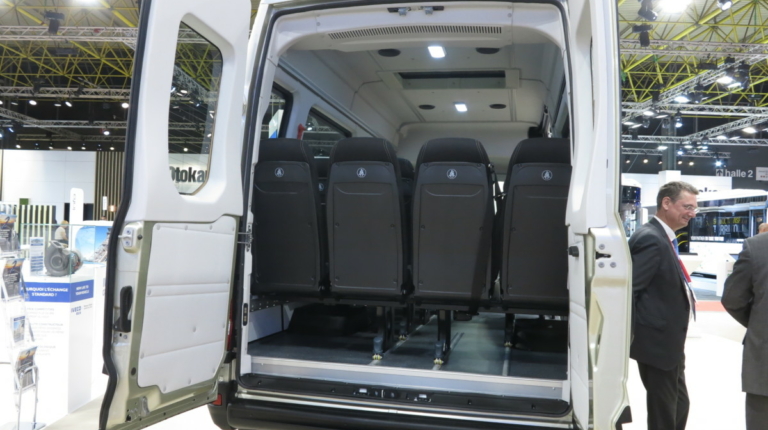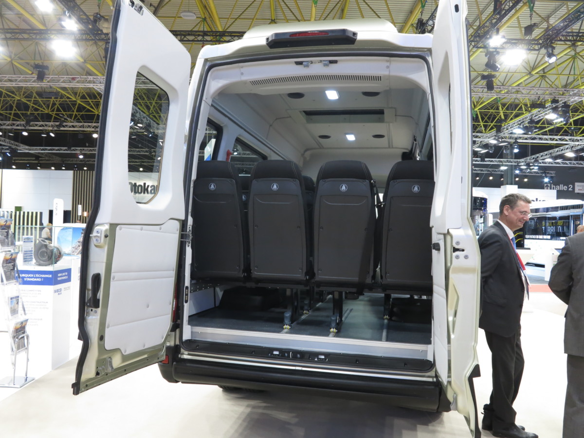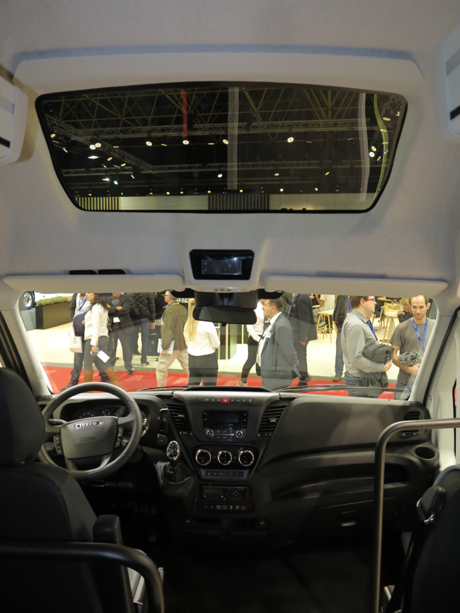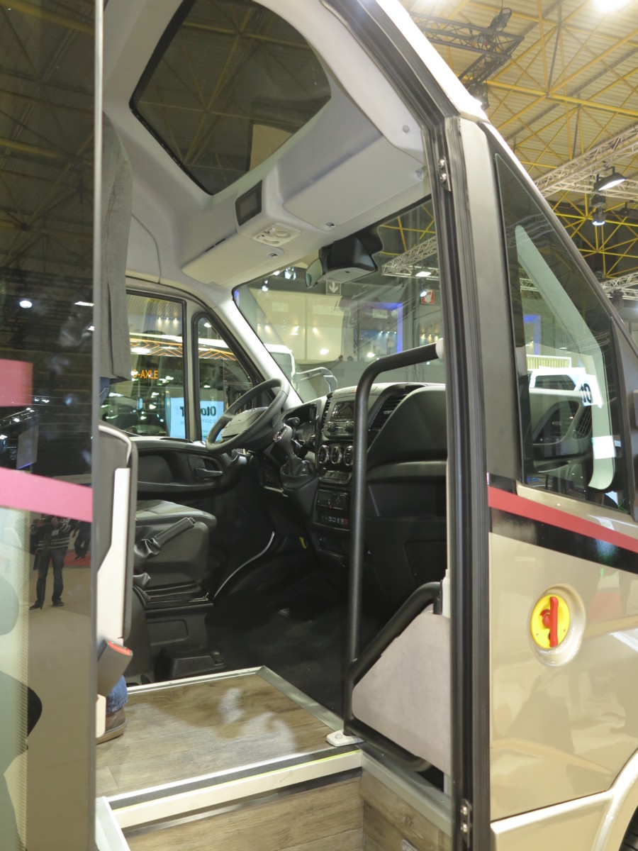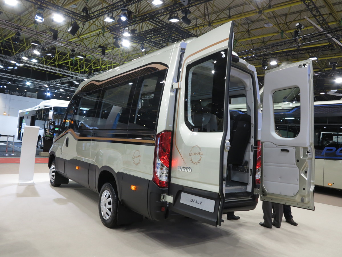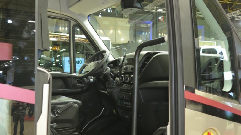 Второй автобус на стенде IVECO Bus на выставке Busworld 2017 – это модель Daily Start. Эта машина отличается более компактными размерами: длина – 5963 мм, ширина – 2052 мм и высота – 2900 мм. Эта машина предназначена для работы в качестве шаттла на небольшие расстояния. Здесь боковая сдвижная дверь, как на фургоне. Аналогичные и задние распашные двери, за которыми есть небольшое место для багажа.