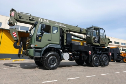 Дрогобычский завод автокранов недавно выпустил новинку – КТА-25.02 «Силач» на шасси Mercedes-Benz Actros. Данная модель – это технический компромисс между оптимальной грузоподъемностью 25 тонн и увеличенными вылетом стрелы и высотой подъема. Стрела – 4-секционная, изготовленная из гнутого профиля высокопрочной стали. Вылет стрелы – 26 м, высота подъема – 32 м, длина стрелы – 30,4 м. Увеличенный опорный контур, передние опоры которого являются поворотными, а задние – выдвижными, гарантирует устойчивость КТА-25.02 в работе. Модель укомплектована приборами безопасности ПЗК-10 и СНЭП, в качестве опции предусмотрена система радиодистанционного управления. К услугам оператора – комфортабельная кабина нового образца со встроенными отопителем и кондиционером.