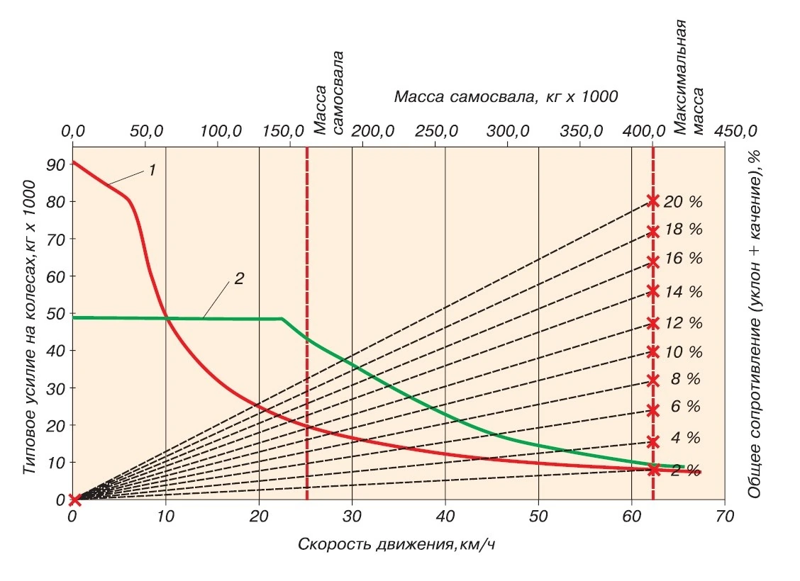 В процессе проектных работ дизель-троллейвоза грузоподъемностью 240 тонн выполнен расчет тягово-динамических характеристик. Результаты расчета показывают значительное увеличение скорости и улучшение тягово-динамических характеристик самосвала в троллейном режиме.