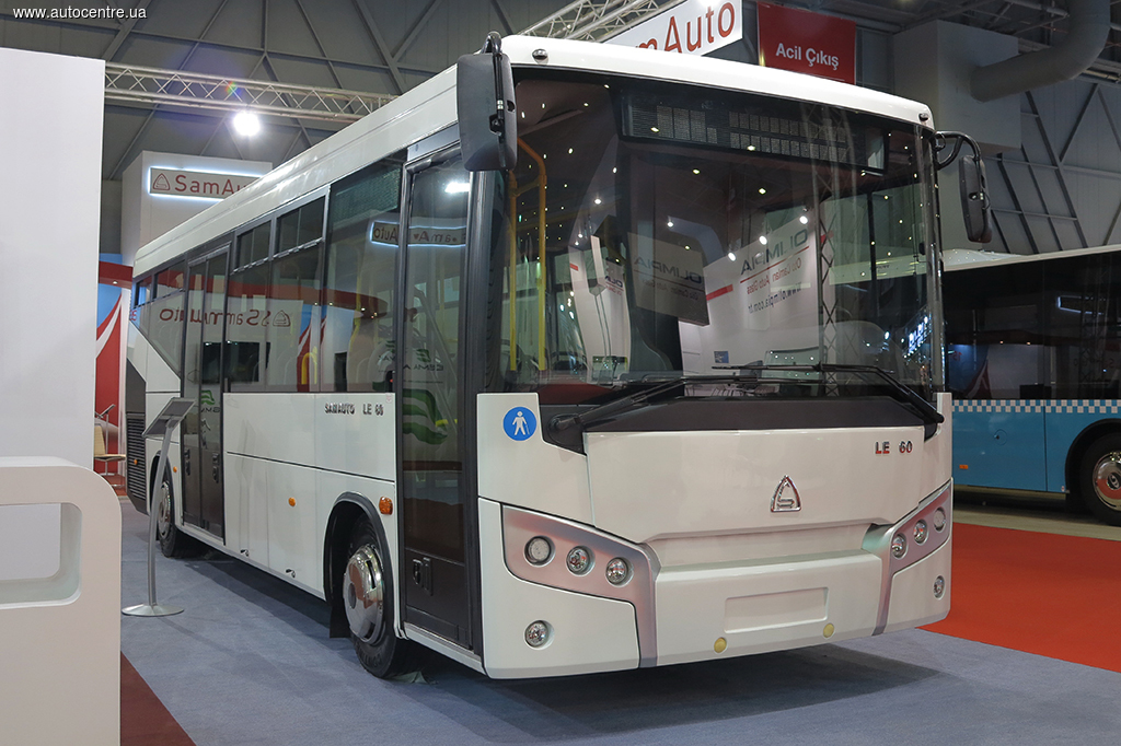 Небольшая турецкая фирма SamAuto приехала на выставку с двумя городскими автобусами. Первая из них – бюджетная модель малого класса HD41, построенная на шасси Isuzu. Она имеет длину 6,9 м и вмещает 45 пассажиров (мест для сидения – 18). Двигатель Isuzu на 4,5 л мощностью 121 л. с. отвечает устаревшим экологическим стандартам Евро 2. Подвеска колес – рессорная. Другой автобус – низкопольник среднего класса LE60. Он имеет длину 8,06 м и салон на 56 пассажиров (мест для сидения – 25). Турбодизель Сummins (Евро 4) в 4,5 л развивает 185 л.с. С ним агрегатируется автоматическая КП Allison. Подвеска колес – пневматическая.