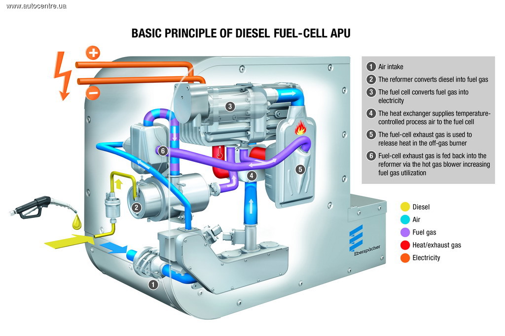 Компания Eberspacher создала революционную систему Diesel fuell-cell APU, которая преобразовывает дизтопливо в электричество без механической энергии.